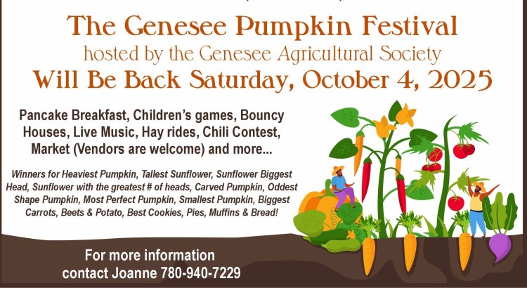 It is time to nurture your garden bounty so that you can enter in this fun harvest competition in October. Join us for the annual Genesee Pumpkin Festival! Contact Joanne @ 780-940-7229 for more information!